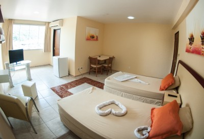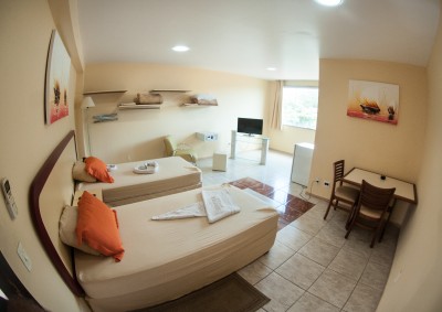 Acomodações modernas e equipadas com cama Box King Size, TV LCD com canais a cabo, ar condicionado, cofre digital eletrônico, frigobar, acesso a internet Wi-Fi e café da manhã incluso.